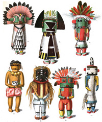 This conflict will begin when the Blue Star Kachina (Saquasohuh)(versions pictured under the heading), dances in the plaza and removing his mask before uninitiated children. The Hopi prophecy predicted World Wars I, and II. World War III has also been predicted by the Hopi prophecy to begin soon.